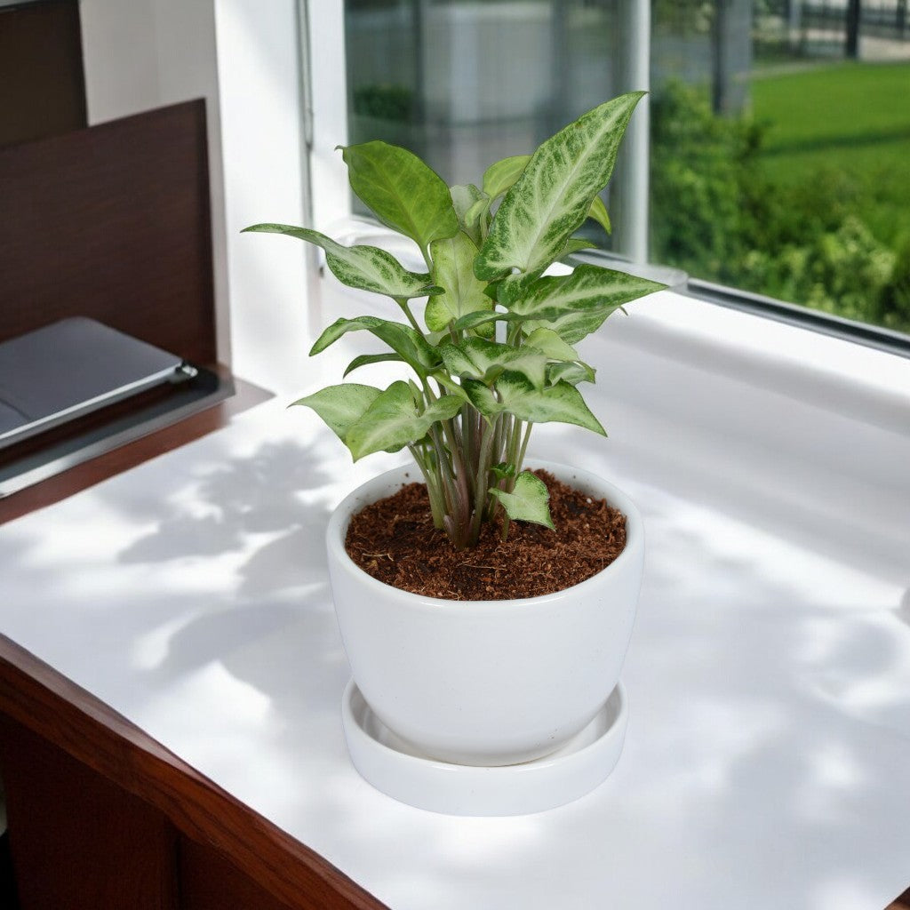 Gift a vibrant Green Syngonium in a 3x3.5 inch sleek white mini egg-shaped ceramic planter with a matching plate. Ideal for both indoor and outdoor spaces, it requires minimal water and indirect sunlight. Includes packaging and single-side branding up to 2 inches.
