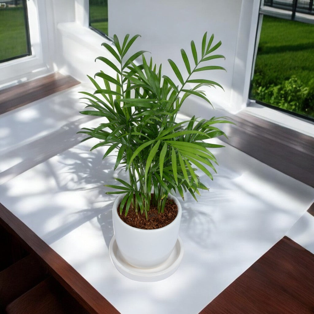 A stylish Parlour Palm (Chamaedorea Elegans) in a 4x4 inch white egg round ceramic planter with plate, perfect for indoor or outdoor spaces. Needs minimal water and bright indirect light. Includes packaging and up to 2-inch single-side branding—an excellent gifting choice.